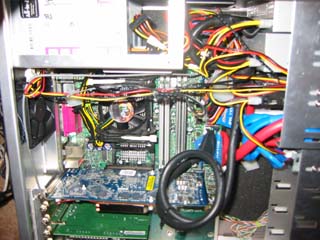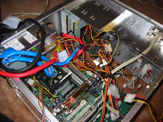 ケーブルの長さがちょっとあまっちゃったのよねぇ。ということで、あいている5インチベイにねじ込んだ結果がこれ。まぁCPU上空が開いているので許せ。