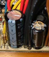 左側の大きいコンデンサは正常ですが、右側の小さいコンデンサ。頭がちょっとさびて、膨らんでいます。実はこれ、上に塩?みたいな塊がくっついていまして、明らかに中からなんかが染み出した形跡。エアで吹き飛ばしてから気がついたんですけどね。このコンデンサ以外にももう1個液漏れを発見。