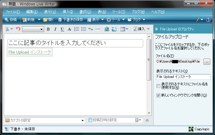 Windows Live Writer上で、ファイルのアップロードとそのファイルへのリンクの挿入を簡単に行うことができるプラグイン、ファイルアップロードプラグイン ver 1.0.0 for Windows Live Writerの取り扱い説明書です。