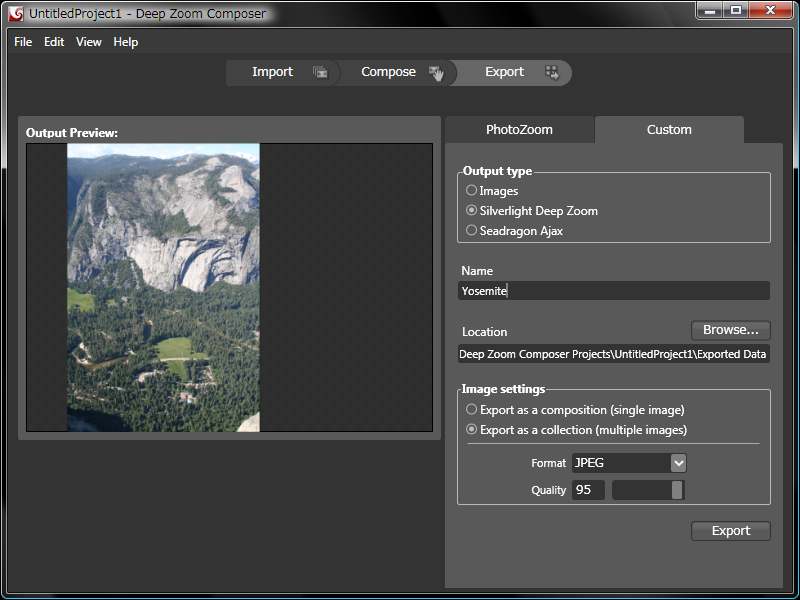画像の配置が終わったら、上から「Export」を選択すると、上の画面になる。このまま、PhotoZoomというMicrosoft Labが運営するサイトに結果を転送してもいいが、全部自前で遊んでみたい僕としては「Custom」タブを選択。