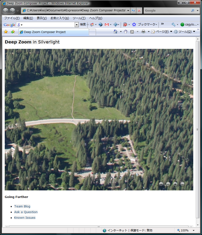 「Seadragon Ajax」を選択すると、同様にそのイメージを表示するためのHTMLが生成されるが、これはSilverlightを使用したものではなく、Java Scriptで実装したものらしい。スクリプトはhttp://seadragon.com から調達の模様。Silverlightが動かない環境でも、Deep Zoomを使った画像表示ができるというのが狙い。
