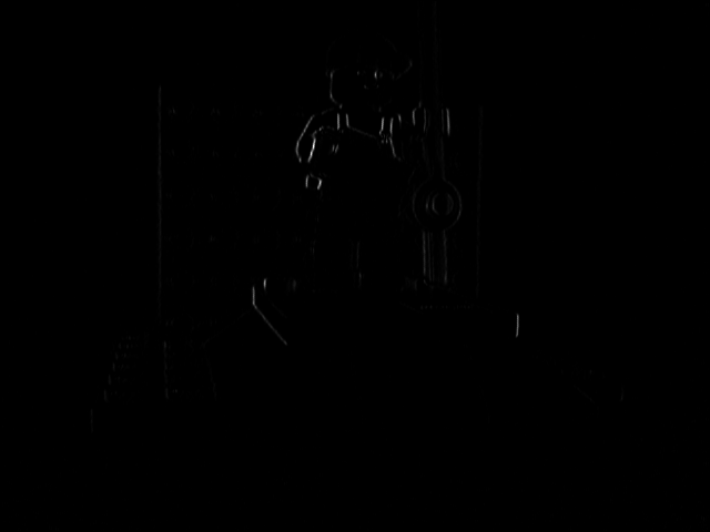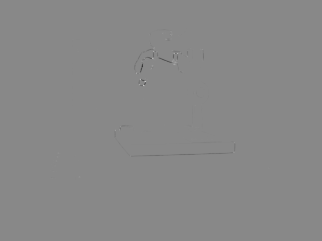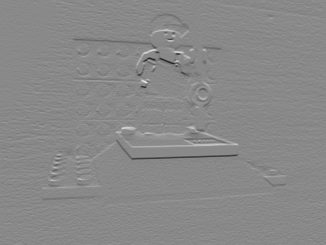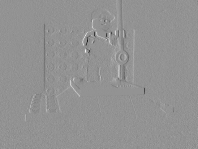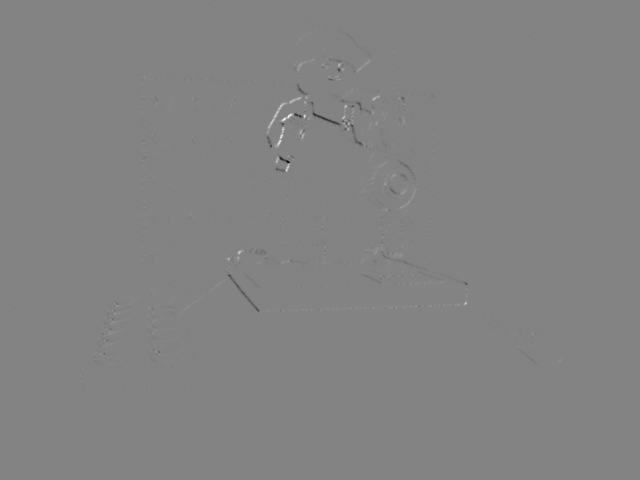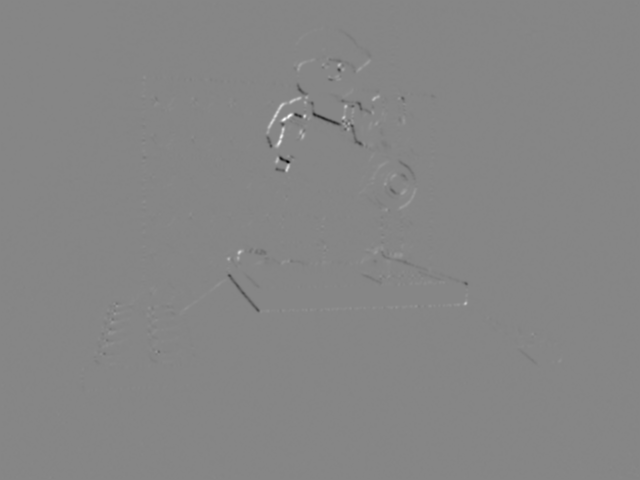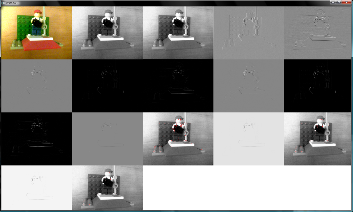 x方向微分の画像は、Min/Maxの値は-602/442。y方向微分の画像は、Min/Maxの値は-513/438。それぞれの値を、0から255にマップして表示している。一応全部Floatで計算。