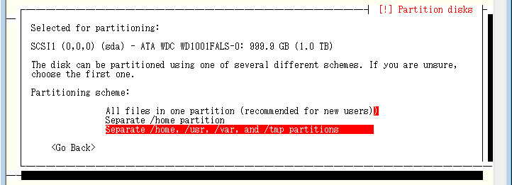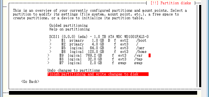 ということで、こんな感じに決定。/varがいっぱい。/homeもSambaのshareのかわりに使うのでそれなりに。/tmpとswapちょっととりすぎかな。