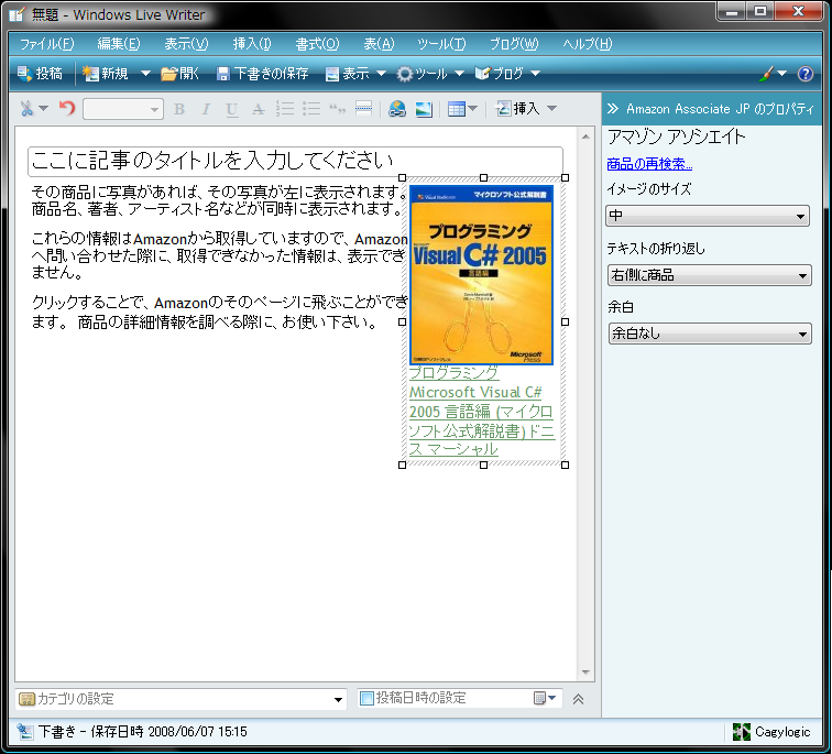 Windows Live Writer上で、Amazonアソシエイトへのリンクを 簡単に挿入することができるプラグイン、Amazon アソシエイト プラグイン ver 1.4.1 for Windows Live Writerの取り扱い説明書です。