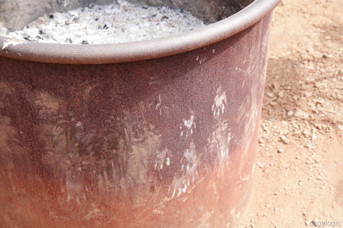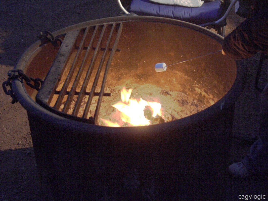 普通の薪だったら、割ったりして下準備して、大体の火の加減を調節するんだけど、この、おがくずを樹脂で固めたやつは、斧で割ろうとすると、ぼろぼろと崩れていく。固まっている間は、安定して燃えるんだけど、一旦崩れると、すごい炎。おがくずに含まれている樹脂だか、松やにだかが、燃えて、炎がでるんだろうけど、細かく崩れると、これらが不完全燃焼を起こすのか、すごい煙とともに炎がいっぱい。