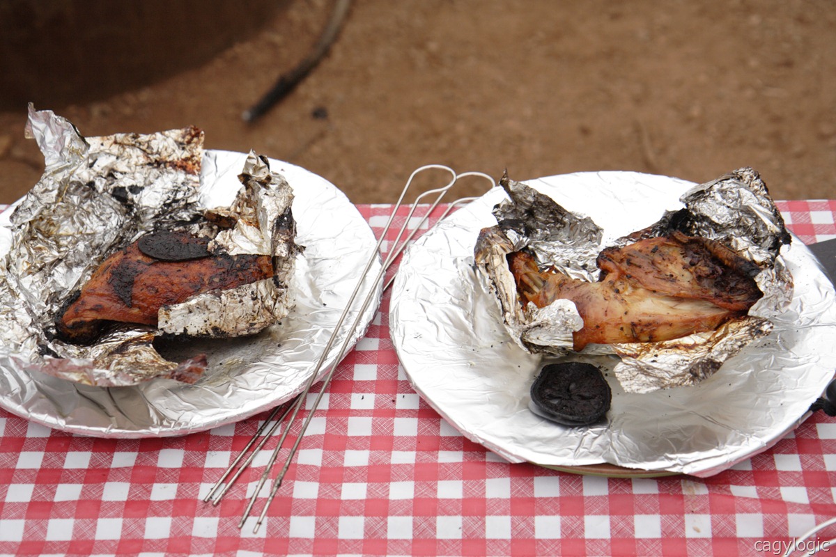 メインディッシュは鳥のもも肉です。アルミホイルに、オリーブオイルを塗りたくって、塩コショウ。ローズマリーとレモンを振っただけ。レモンの輪切りは見事に炭になりましたが、肉はとってもいい感じ。