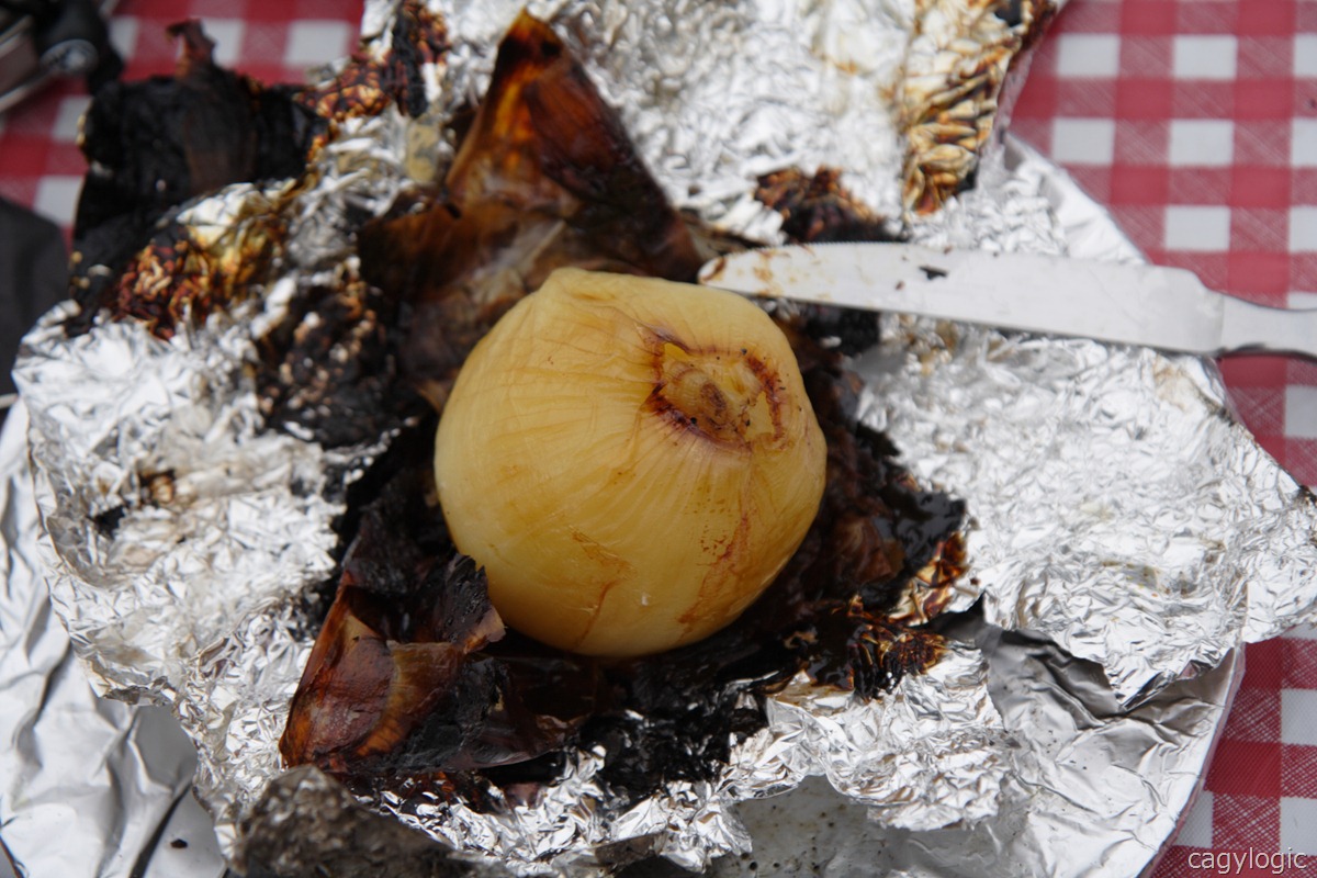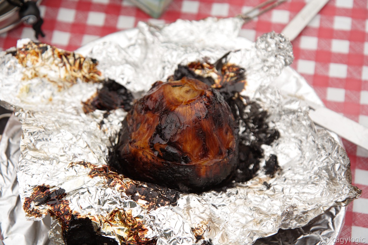 玉ねぎをアルミホイルにくるんで、焚き火に投入しただけ。皮すら向いてない。