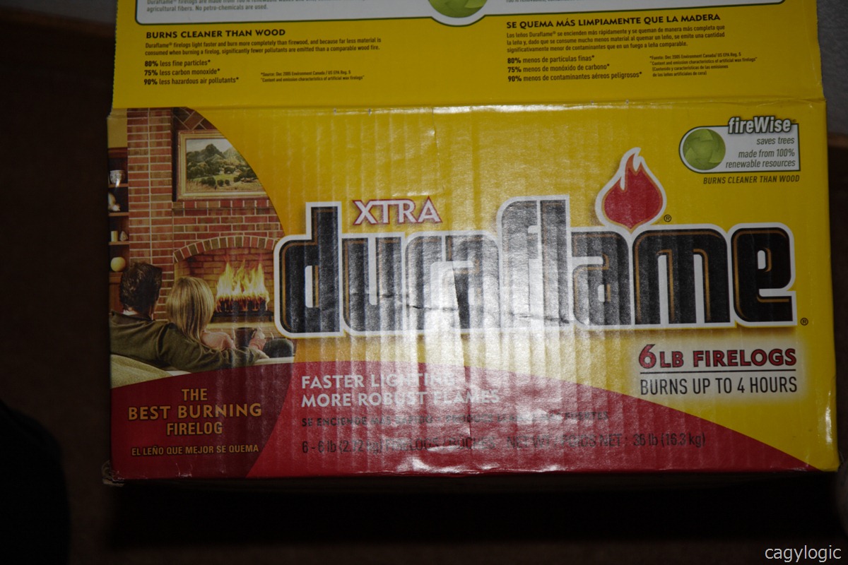 僕も普段は、スーパーで、暖炉用の薪を買ってくるんだけど、今日はちょっと違うものに挑戦。ということで、duraflame。こいつは、普通の薪じゃなくて、おがくずを樹脂で固めた物。火の付きがとっても良くて、火の持ちもいいらしい。