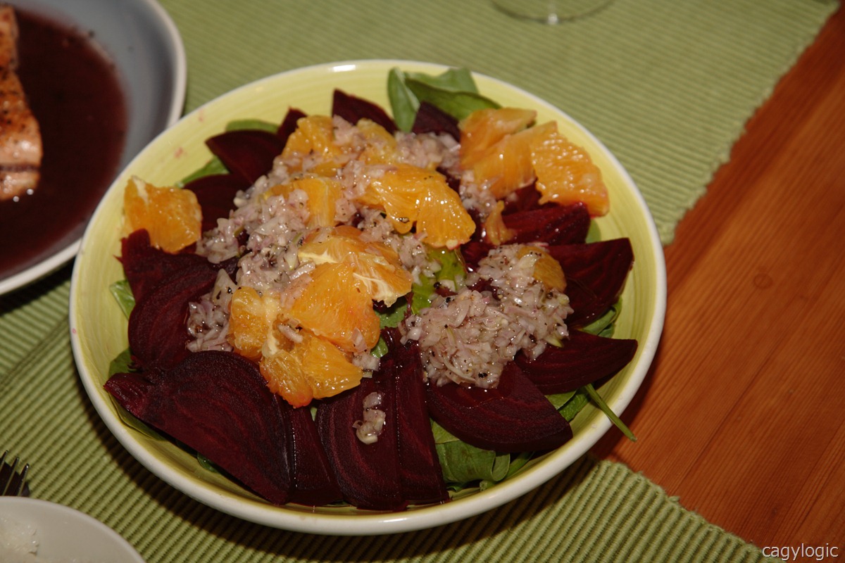 ほうれん草のサラダの上に、スライスしたビーツとオレンジを散らす。