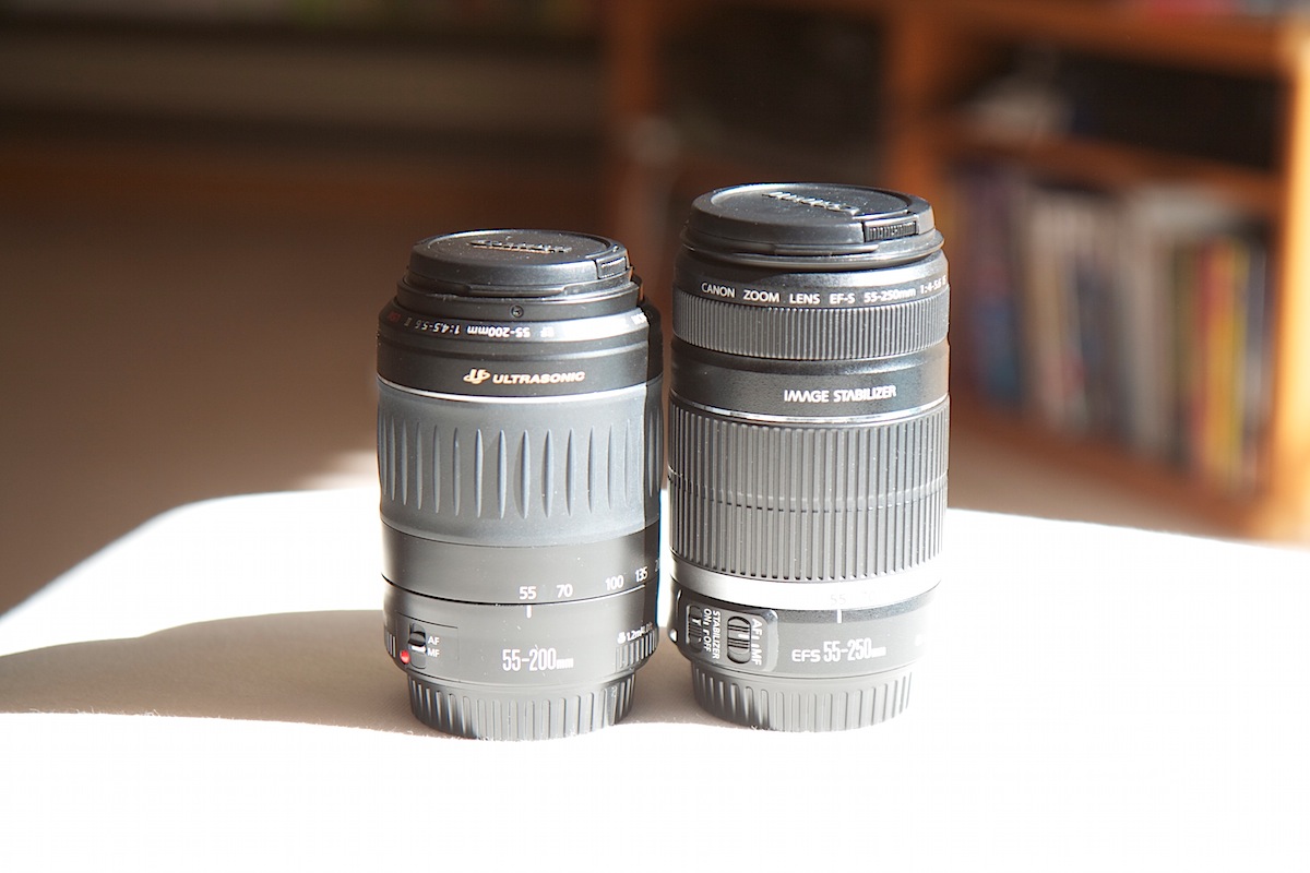 左は以前から持っていた、EF 55-200mm F4.5-5.6 II USM。こいつで不満だったのは、IS、Image Stabilizer、要するに手ぶれ補正がついてない。手ぶれ補正欲しかったんだよね。望遠になればなるほど手ぶれ補正が欲しいのに、もってなかったもんだから、以前から気になっていた一品。