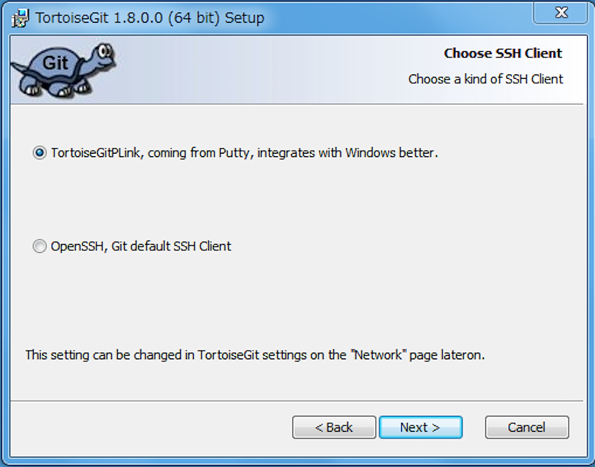 なんか聞かれた。SSH接続するのに、PuttyからTortoiseGitPLinkを使うか、OpenSSHを使うかの選択。integrates with Windows betterとか言われてるので、TortoiseGitPLinkを選択(デフォルト)