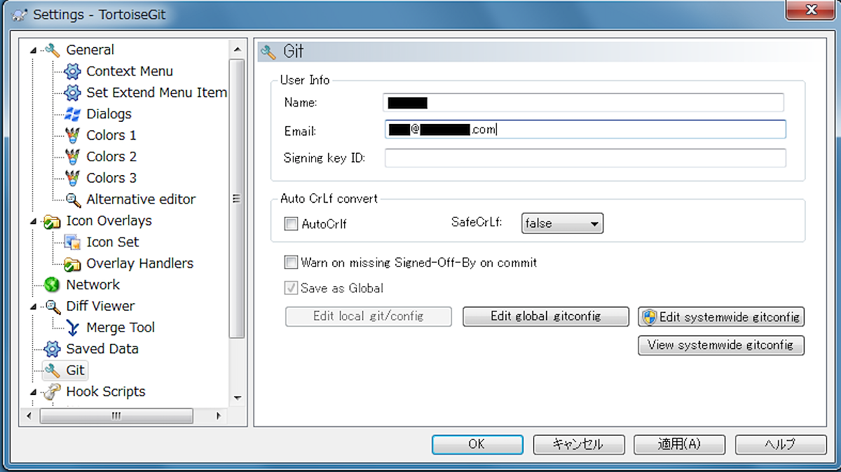 TortoiseGitのSettingを右クリック開いて、ユーザー情報の設定。名前とメールアドレスを設定する。Gitのcommitの際に誰がcommitしたのかを示すための文字列。適当に。。。