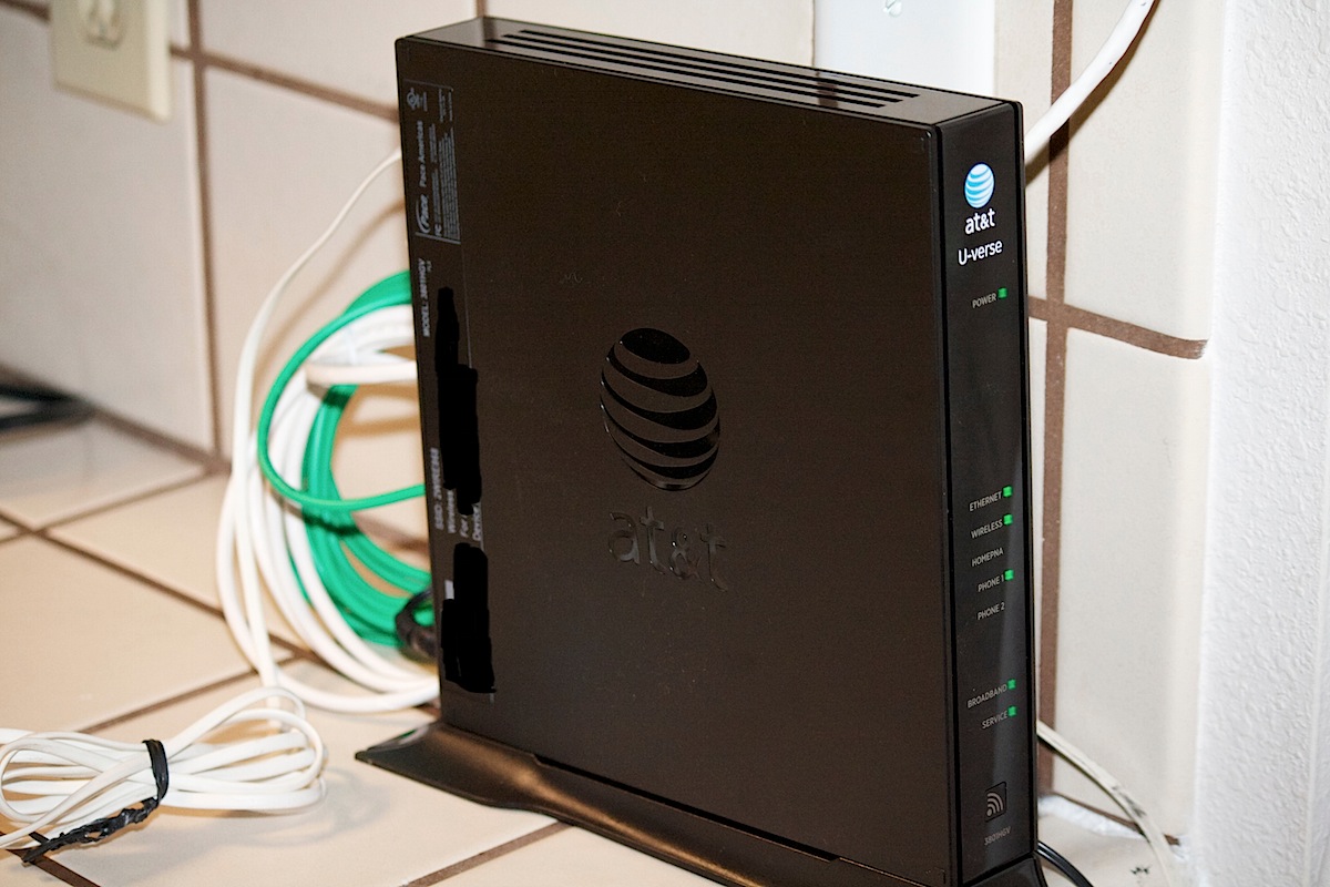これがセットアップのおっちゃんが持ち込んだ新しいモデムルーター。U-VerseはVDSLということでモデムも変更になる。AT&Tと箱に書いてあるけど中身は、2wireの3801HGVの模様。