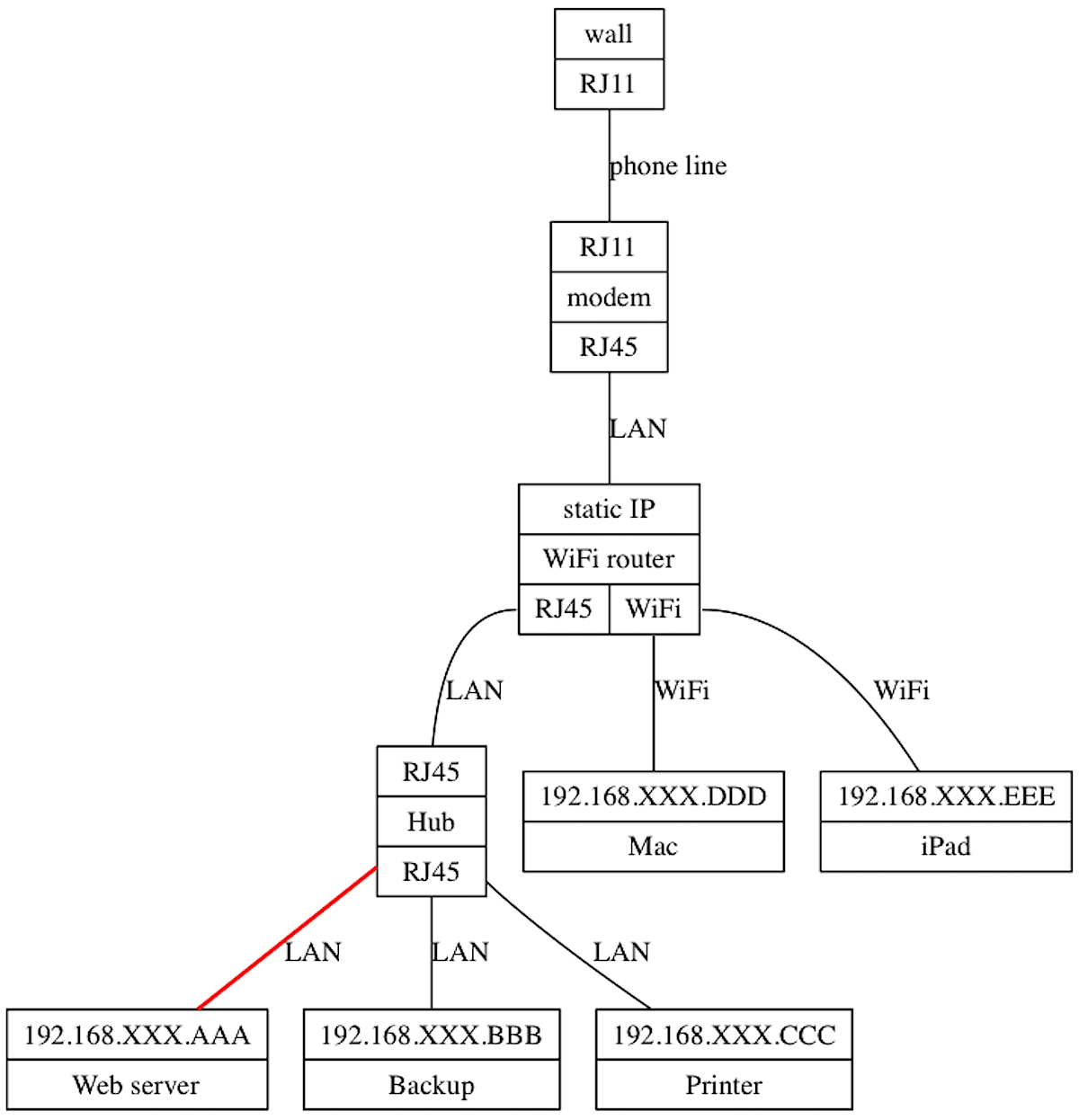 これが、ADSL時代のネットワーク構成。ADSLモデムとルーターは別の箱。ひとつの箱のやつも使ってたんだけど、ルーターが壊れたり、WiFiが調子悪くなったりしたときに、別の箱の方が楽だったので、別の箱で。Web Serverには、Private IPが割り振ってあって、Static IPはルーターに割り当てる。ルーターの設定で、ポートフォワードでhttpの80をWebサーバーに流す設定。