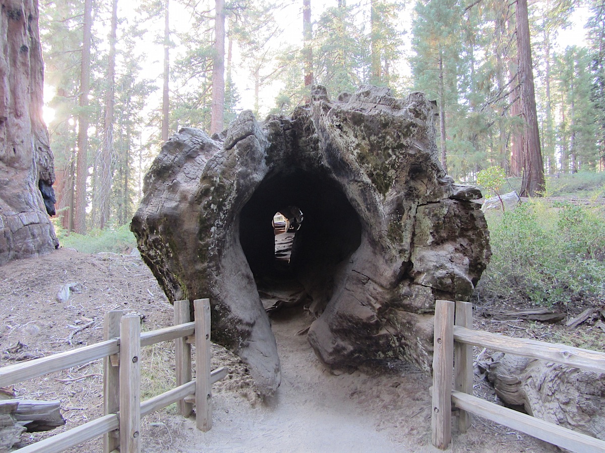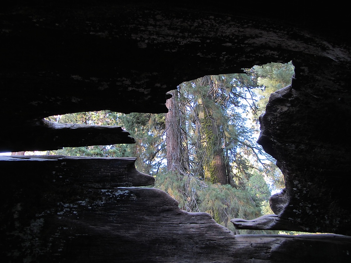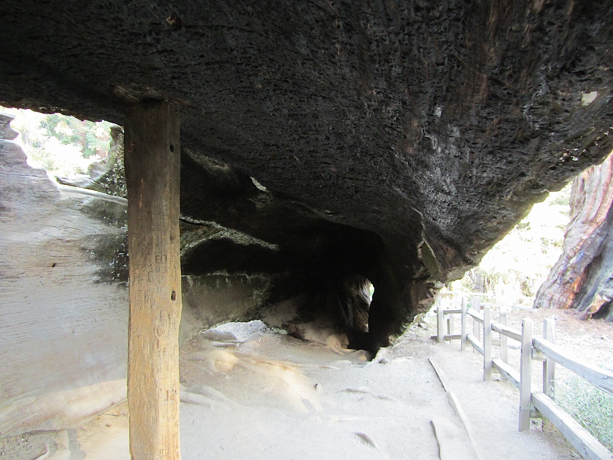 倒木の中がえぐれてて、通り抜けられる。